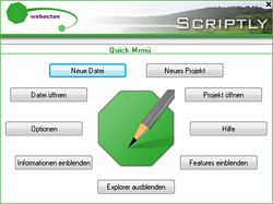 Es sind nicht unbedingt teure Programme nötig, um eindrucksvolle Seiten zu erstellen. Freeware verrichtet das ebenso. Freeware Editoren gibt es viele im Netz zum Download. Script-Editoren sind Textprogramme mit speziellen Funktionen für Programmiersprachen. Die bekanntesten sind wohl Programmers Notepad++ und der Webocton Scriptly, den wir benutzen. Scriptly verarbeitet alle notwendigen Sprachen zum erstellen von komplexen Seiten. Ob HTML, PHP, JAVA-Script oder CSS.